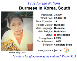 Alternatively, you can pray for the Burmese people in South Korea. Although South Korea is significantly reached (praise God!) there are still minority groups within South Korea who are unreached. Burmese people's main religion is Buddhism and there around 23,000 living in South Korea.